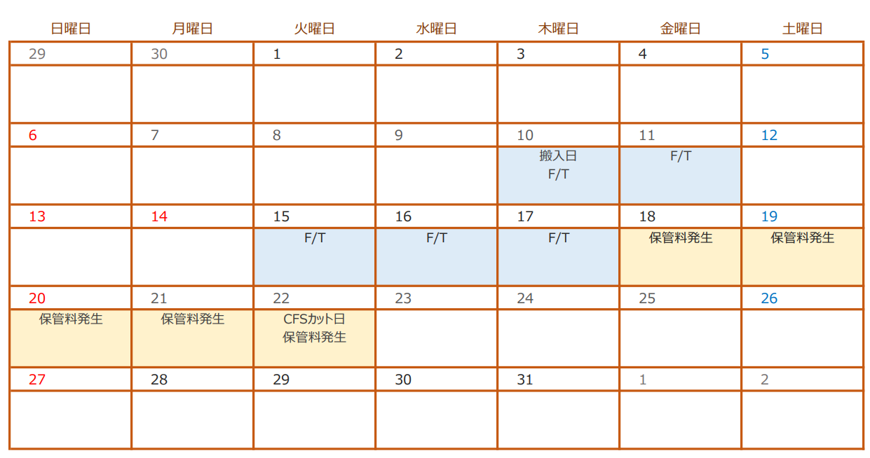 東京、横浜発のCFSフリータイムは搬入日より起算して5営業日となります。